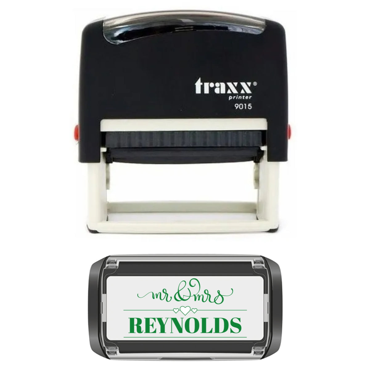 Traxx 9015 Mr & Mrs Stamp | Customisable Name, Message, or Date with Heart Design | 70x30mm Impression Size
