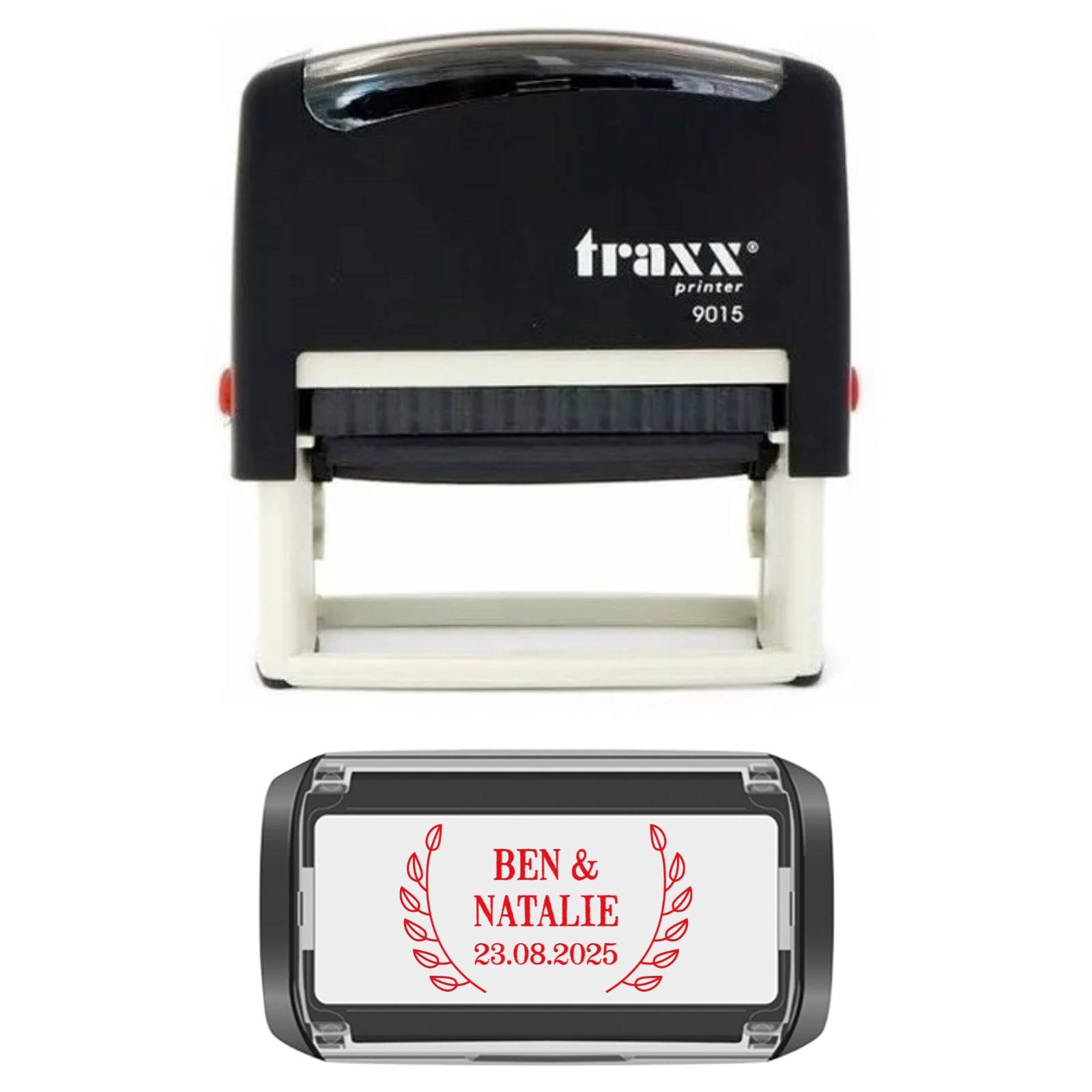Traxx 9015 Wreath Design Wedding Stamp | Custom Names & Date | 70x30mm Impression Size
