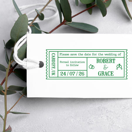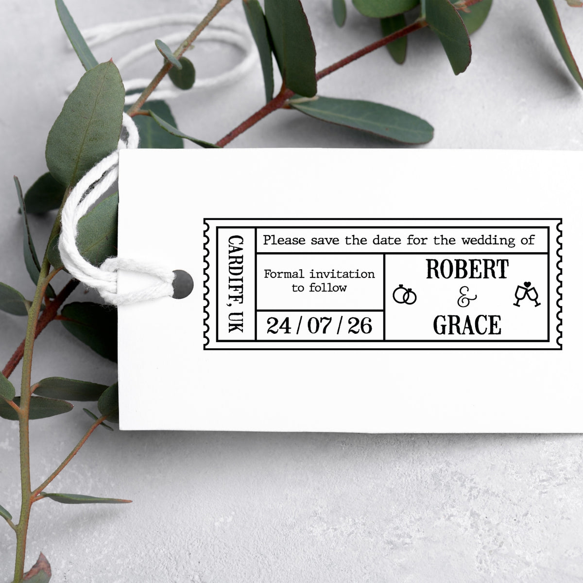 Traxx 9015 Wedding Stamps – Custom Wedding Ticket Design with Personalised Venue, Names, and Date – Perfect for Invitations, Envelopes, or Favours