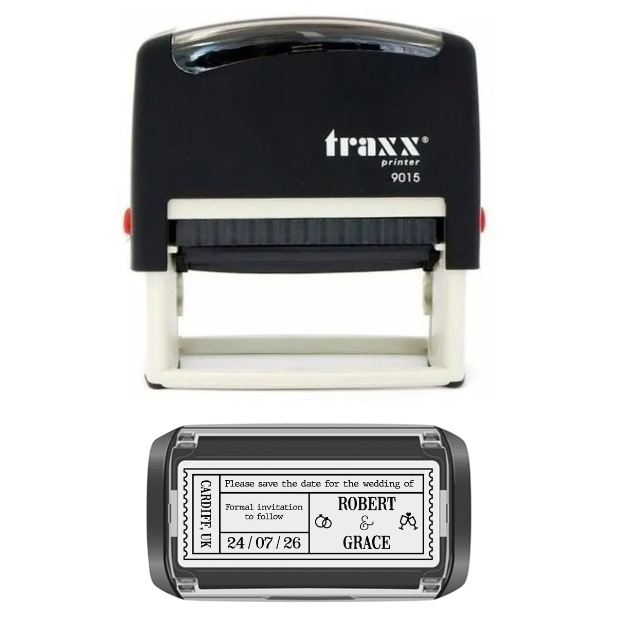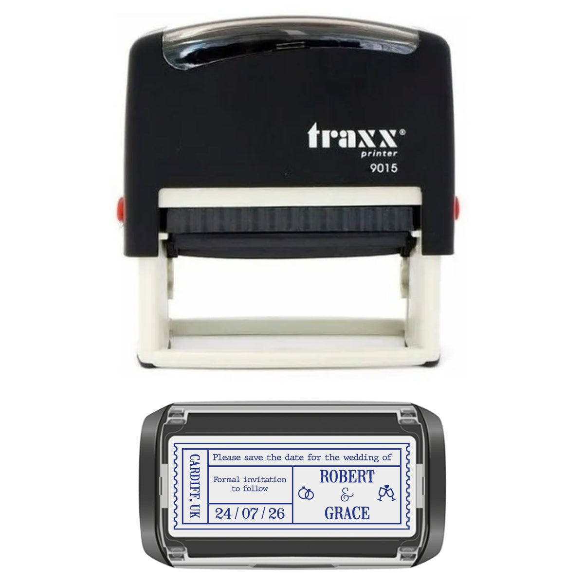 Traxx 9015 Wedding Ticket Design Stamp | Custom Venue, Names & Date | 70x30mm Impression Size